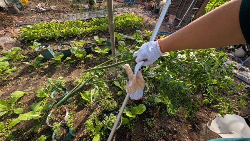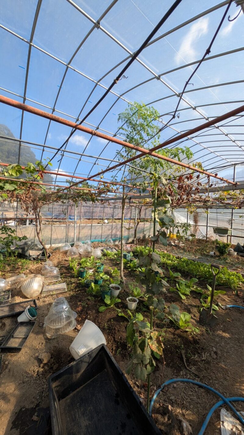 ガラスの天井ならぬ、ビニールハウスの天井破ると困るので剪定です。
